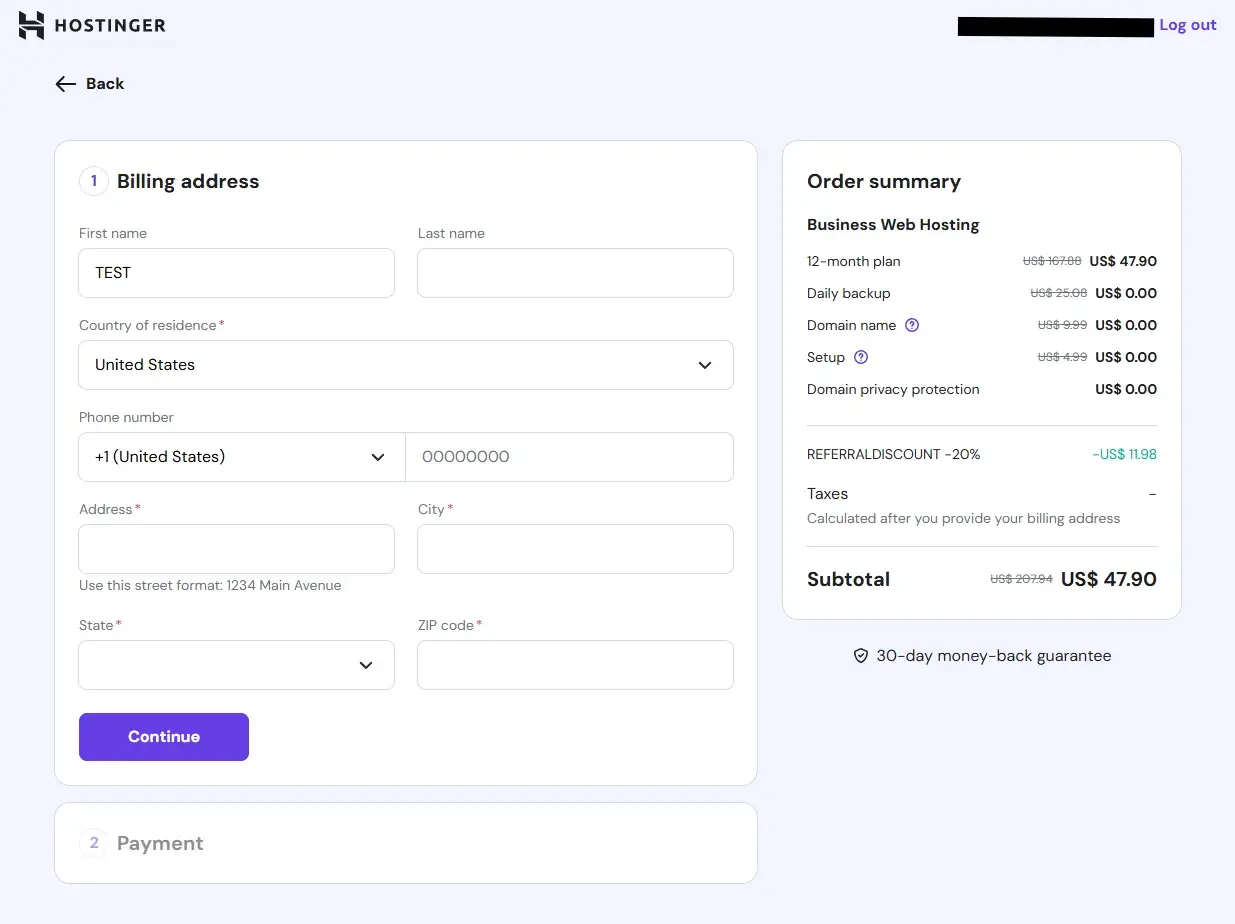 Confirm you see the discount reflected on the Hostinger checkout summary before payment.