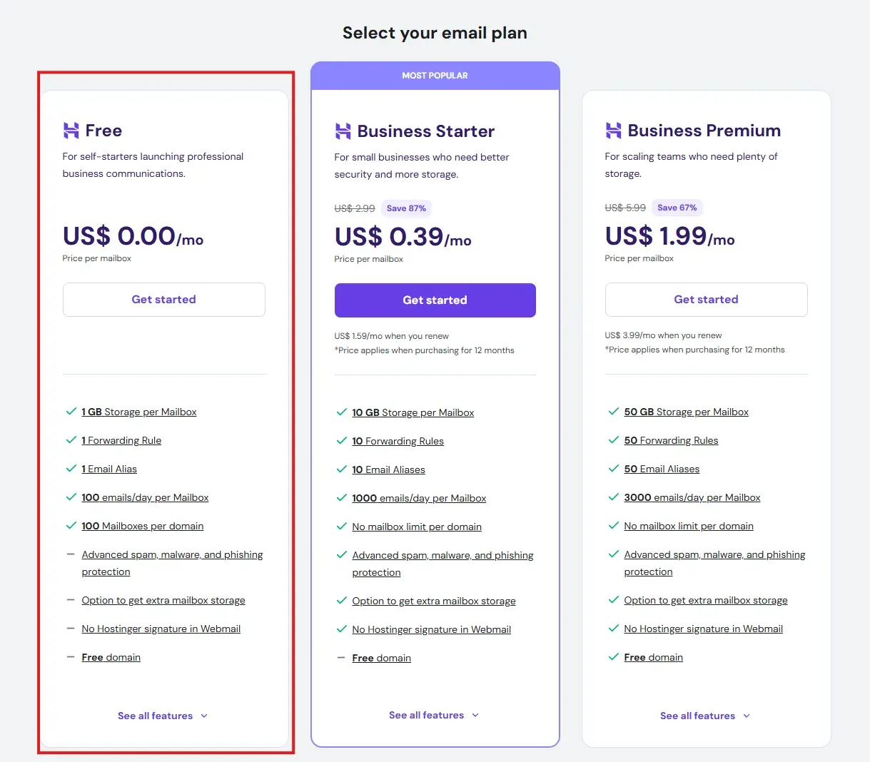 | Plan | Websites | Storage | Mailboxes | Backups | Security & Extras |