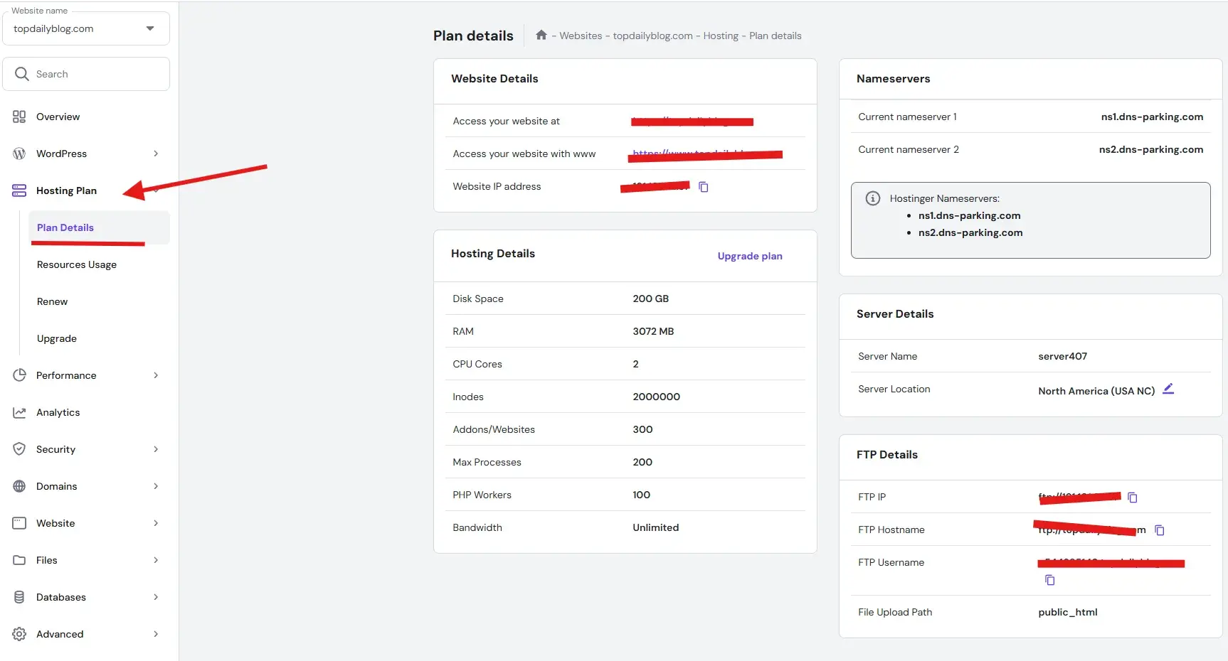 Websites → Dashboard → Hosting plan → Plan Details: see domain, IP, limits, nameservers in one view.