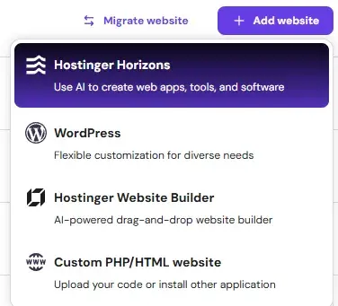 The three main ways to launch your site: WordPress, Hostinger Website Builder, or manual/blank upload.