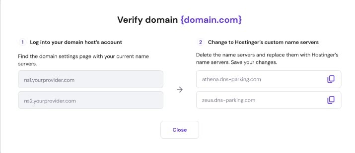 If your domain is purchased elsewhere, Hostinger can assign custom nameservers in hPanel to verify ownership when connecting through the VPS DNS Manager.